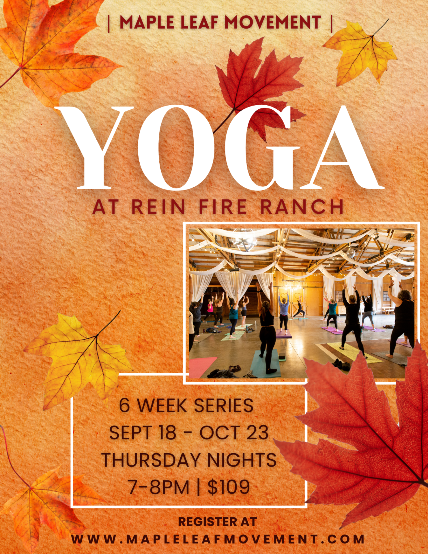 Join us at Rein Fire Ranch for a relaxing 6 week yoga series! This stunning venue is sure to add ambiance and serenity to your yoga practice. Our classes will be held in the spacious and beautifully restored barn.