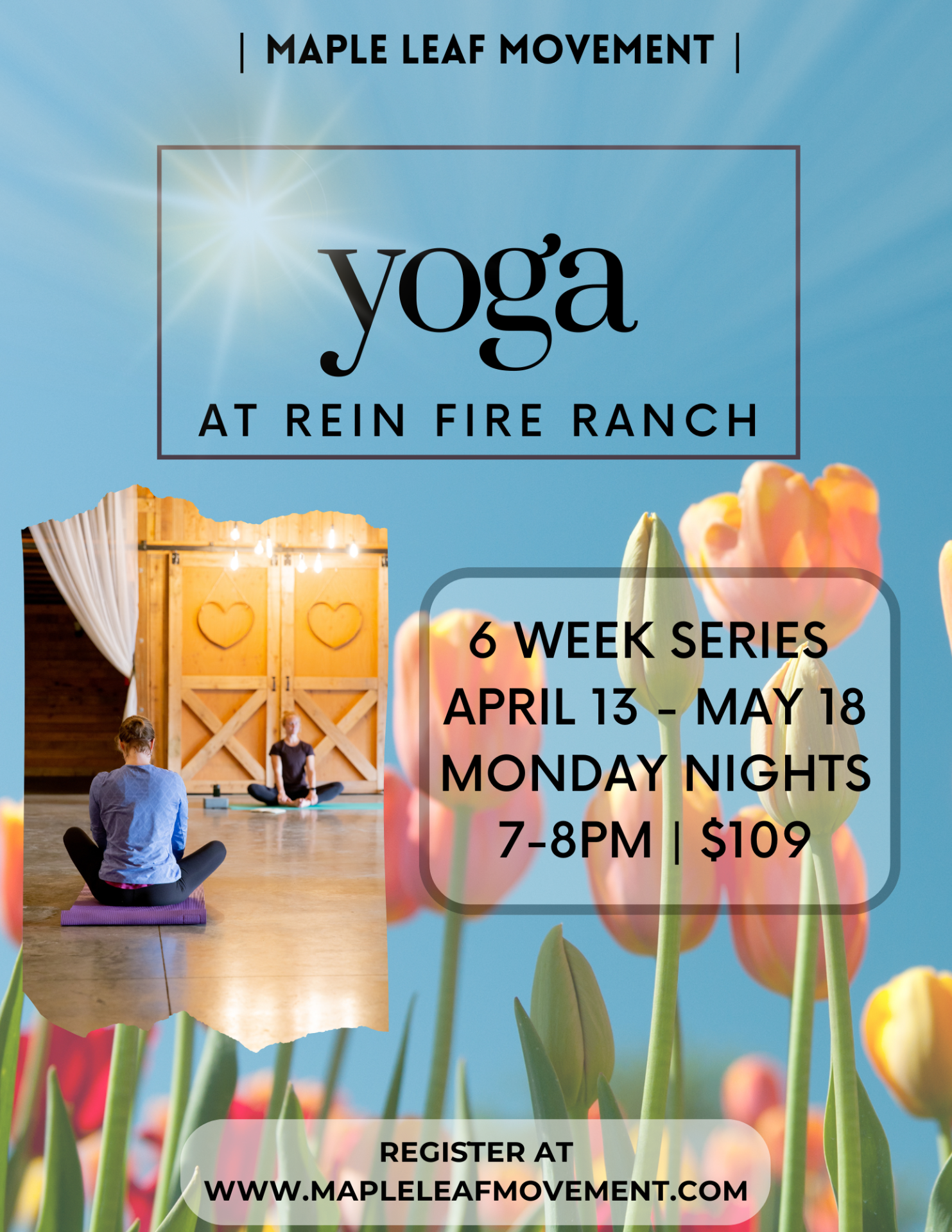Join us this spring at the beautiful Rein Fire Ranch for 6 relaxing weeks of yoga! Our class will be held in the spacious and beautifully restored barn, offering plenty of space for each class member. This stunning venue is sure to add ambiance and serenity to our yoga practice.
